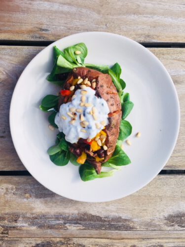 Gevulde zoete aardappel met yoghurt- citroen saus