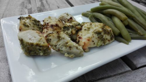 Laat je verrassen door de 'Gemarineerde kip met pesto uit de oven'! Heerlijke kipfilet, perfect gemarineerd en gegaard met romige groene pesto, zongedroogde tomaatjes en knapperige pijnboompitjes. Dit smaakvolle en eenvoudige gerecht is ideaal voor een snelle maaltijd of een gezellig diner. Een echte aanrader!