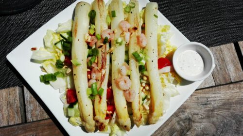 Ontdek de perfecte combinatie van fris en gezond met dit heerlijke recept: Asperges met garnalen - Lekker en gezond! Geniet van malse asperges, sappige garnalen en een lichte dressing, geserveerd op een bedje van sla. Een snelle, smaakvolle maaltijd die je smaakpapillen zal verwennen.
