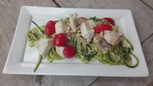 Zin in een snelle, gezonde en heerlijke maaltijd? Probeer dan dit recept voor Courgetti met pesto en kip! In slechts 25 minuten zet je een smaakvol gerecht op tafel, vol verse courgette, malse kip en aromatische pesto, afgemaakt met knapperige pijnboompitten. Perfect voor elke dag!